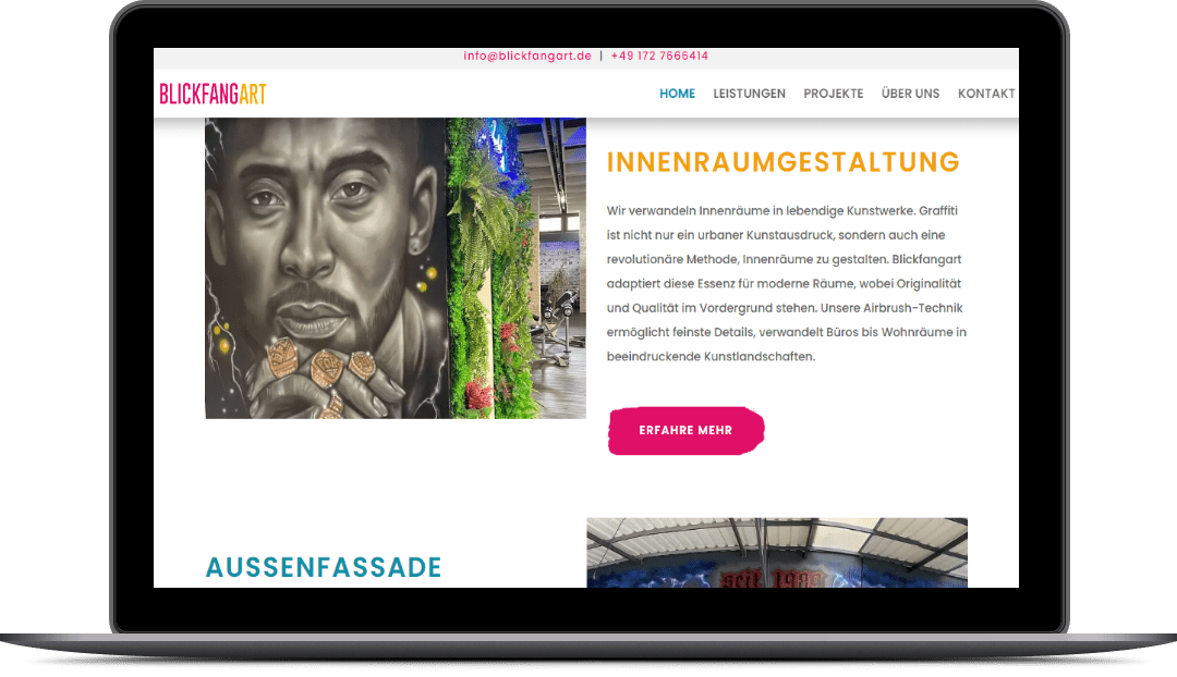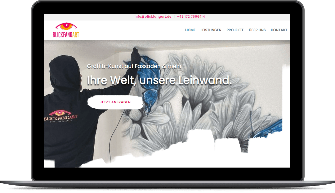 Blickfangart wollte eine Website, die ihre Kunst und ihr Können optimal präsentiert und mehr potenzielle Kunden anzieht. Wir haben uns dieser Herausforderung gestellt und eine Website geschaffen, die die Leistungen und Projekte von Blickfangart in einem modernen und frischen Design zeigt. Die Website ist übersichtlich und benutzerfreundlich gestaltet, mit einem klaren Menü und einer einfachen Navigation. Die Website ist, wie all unsere Websites, für mobile Geräte optimiert, so dass sie auf verschiedenen Bildschirmgrößen optimal angezeigt wird. Die Website verwendet helle und kontrastreiche Farben, die zu dem Thema der Graffiti- und Airbrush-Kunst passen.